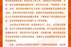 在此,山东泰山足球俱乐部呼吁广大媒体和球迷朋友,务必保持理性与客观,不造谣、不信谣、不传谣:通过俱乐部官方指定渠道购买周边商品,抵制盗版产品,共同营造健康、积极的网络环境与足球氛围。让我们抵制一切不良信息与恶意行为,共同推动中国足球事业的良性发展。