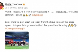 周定洋在个人微博中写道:半决赛,我们来了!!小伙子们今天表现太棒了,又一次挺进四强… 今年让我们走得更远吧!周六见 🙏💪⚽️