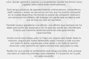 “结束这段旅程让我心痛,但我自豪地告别,因为我已经全力以赴,捍卫了这些颜色和队徽。回顾过去,我为走过的每一步感到自豪,并且我将永远是一名瓦伦西亚人。”