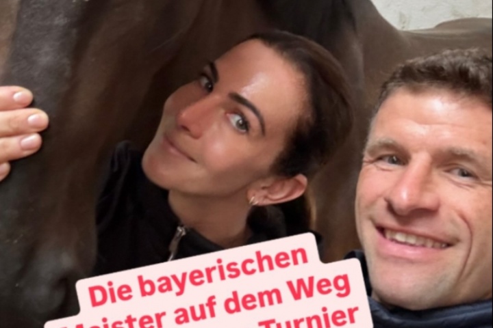 破婚变传闻?穆勒晒与妻子马匹合照:巴伐利亚冠军正准备下场比赛