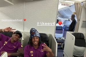 巴德吉随巴萨前往日本,开启亚洲行,他在社交媒体上晒出飞机内的照片,坐在他身后的是孔德和拉什福德。