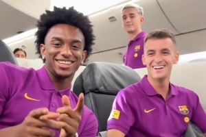 巴萨启程前往日本,开启亚洲行,俱乐部社媒晒出球员们在飞机内的视频,拉什福德喝果汁+刷手机,阿劳霍、拉菲尼亚等多位球员玩游戏,气氛轻松欢乐。