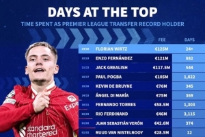 体育资讯7月26日讯 《转会市场》统计了英超历任标王占据榜首的天数,新标王维尔茨刚24天。