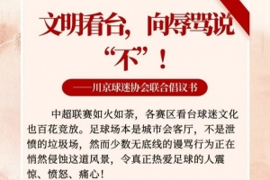 体育资讯7月26日讯 今晚,中超联赛第18轮,成都蓉城将在主场对阵北京国安。赛前,川京球迷协会联合倡议书:文明看台,向谩骂说“不”!