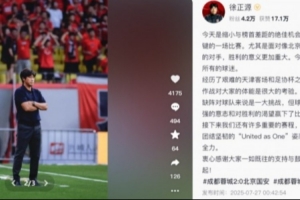 体育资讯7月27日讯 中超联赛第18轮,成都蓉城主场2-0击败北京国安。赛后,蓉城主帅徐正源更新了个人社交媒体。