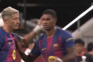 体育资讯07月27日讯 巴萨vs神户下半场,巴萨11人全换,新阵容如下: 什琴斯尼、孔德、阿劳霍、克里斯滕森、乔弗里-托伦斯、卡萨多、德容、奥尔莫、鲁尼-巴尔德吉、莱万多夫斯基、拉什福德。