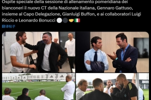 意大利新帅加图索及领队布冯、助教博努奇和里奇奥在今日下午造访了尤文训练基地,和俱乐部上下进行了友好交流。