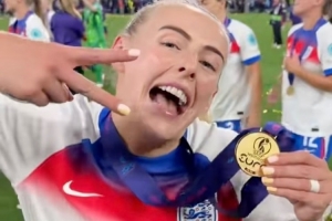 但庆祝远未结束,挂着奖牌的三狮军团女足将士们离场时还上演了音乐表演,在队长莉娅-威廉姆森和贝丝-米德带领下,球员们高唱着Robyn的2010年热门单曲《Dancing On My Own》走进球员通道。