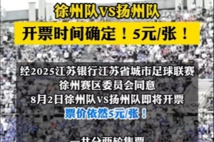 体育资讯7月29日讯 今天《扬州晚报》报道,8月2日徐州队VS扬州队的门票即将开票,票价依然5元/张。
