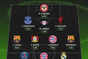 中场:亚马尔(巴萨,8.01分)、维尔茨(勒沃库森,7.50分)、穆西亚拉(拜仁,7.56分)、拉菲尼亚(巴萨,7.62分)