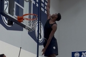 体育资讯7月30日讯 记者Evan Sidery报道,在最近一次杨百翰大学的训练中,AJ-迪班萨展示了他超强的弹跳。从图片中可以看到,迪班萨的垂直弹跳直接让他的头完全高出篮筐。