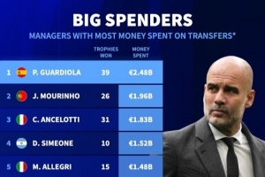 体育资讯7月30日讯 《转会市场》统计了主教练生涯转会费支出榜,瓜帅无悬念居首。