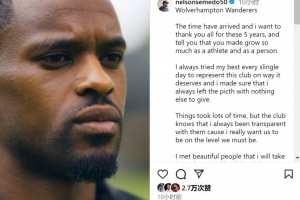 体育资讯7月31日讯 狼队边卫塞梅多将加盟费内巴切,他更新社媒动态,与狼队告别。