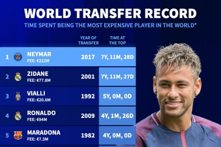 2017年8月3日,巴黎圣日耳曼以震惊世界的2.22亿欧元从巴萨签下内马尔,内马尔也就此一举成为足球历史上身价最高昂的球星。