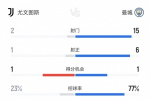 体育资讯6月27日讯 世俱杯第三轮,尤文半场暂1-2曼城。双方半场重点数据对比如下↓(尤文在前)