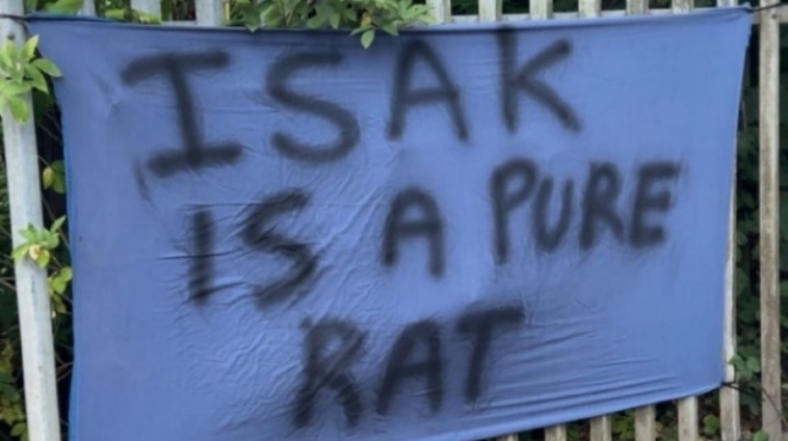 标语上写着:Isak is a pure rat(伊萨克就是一纯纯的鼠辈)。rat也可以译作叛徒,表示纽卡球迷对伊萨克的不满。