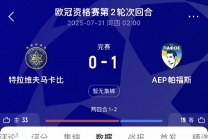 体育资讯8月1日讯 北京时间7月31日凌晨进行的欧冠资格赛第二轮次回合比赛中,特拉维夫马卡比0-1输给帕福斯,两回合总比分1-2不敌对手。
