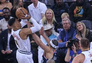 掘金队看到了这一切,但仍然决定将他招至麾下。这是一段崎岖的旅程,其中不乏亮点(他与约基奇的二人配合闪耀全场,他在篮板上的活力也富有感染力),但最终在季后赛中,面对俄克拉荷马城雷霆队的防守时,这段旅程以可预见的崩盘告终,雷霆队放他投篮,而且引诱他运球。威斯布鲁克在这轮系列赛中最终得到17次助攻、18次失误、4次抢断和26次个人犯规。在他上场的时间里,掘金队净负92分,这很大程度上要归咎于他那糟糕的40.2%的有效命中率。