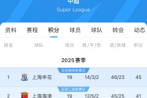 中超半程积分榜↓