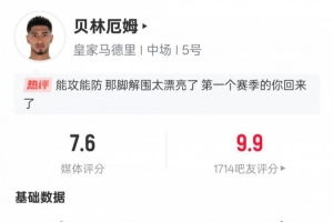体育资讯6月27日讯 世俱杯小组赛H组第3轮,皇马3-0战胜萨尔茨堡红牛。本场比赛,贝林厄姆首发出战,送出1次助攻,3次过人成功,2次关键传球,评分7.6。