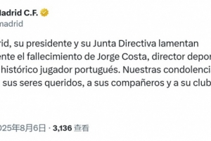 体育资讯8月6日讯 前葡萄牙国脚、波尔图体育总监若热-科斯塔离世,皇马官方发文哀悼。