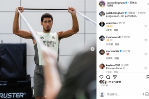 贝林厄姆在个人社媒晒出自己进行康复训练的照片,配文写道:“有一些进展,但还不够完美。”