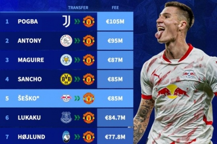 4. 塞斯科(莱比锡红牛→曼联,8500万欧)