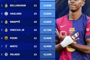 金球奖候选身价榜:亚马尔2亿欧居首,贝林&哈兰德&姆巴佩1.8亿欧