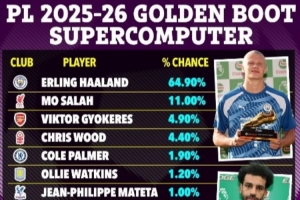 超算预测英超金靴:哈兰德64.9%遥遥领先,萨拉赫第2约克雷斯第3