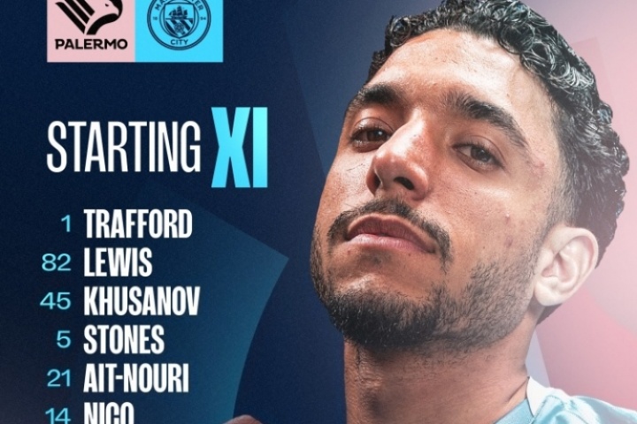 曼城首发:1-特拉福德、82-刘易斯、45-胡桑诺夫、5-斯通斯、21-努里、14-尼科-冈萨雷斯、33-奥赖利、52-鲍勃、29-谢尔基、7-马尔穆什、9-哈兰德