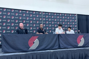 体育资讯6月28日讯 开拓者为杨瀚森举行新闻发布会,主帅比卢普斯与总经理乔-克罗宁一同出席。