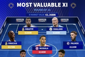体育资讯6月28日讯 世俱杯小组赛全部结束,16强及其对阵出炉。Transfermarkt评选出16强身价最高的11人阵容,11人的市场总身价为13.6亿欧元。