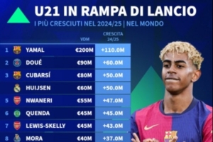 体育资讯6月28日讯 德转列U21球员24-25赛季身价涨幅排行,亚马尔+1.1亿欧居首,杜埃+6000万欧第二,库巴西、怀森并列第三。