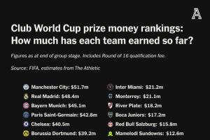 体育资讯06月28日讯 2025世俱杯小组赛战罢,淘汰赛即将开打,The Athletic统计了32支参赛球队目前的奖金明细及其排行。
