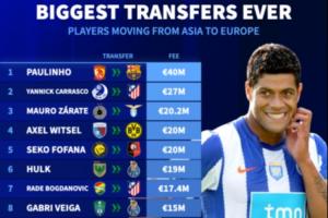 亚洲→欧洲最贵转会排名↓