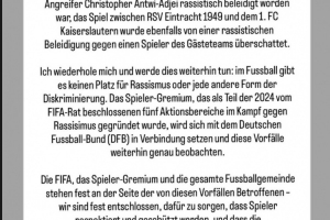 我再次重申,并将继续重申——足球界绝不容忍种族主义或任何形式的歧视。作为2024年国际足联理事会通过的五项反种族主义行动措施的一部分成立的球员委员会,将与德国足球协会联系,并持续密切关注这些事件。