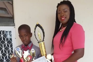 视频中VJ收到了一张童年照片,照片中自己拿着奖杯和妈妈合影。
