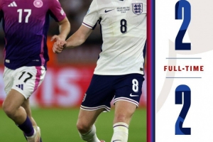 第61分钟,德国开出右路角球至禁区内,第一点被英格兰球员头球顶出,内布尔禁区左侧得球后晃开角度兜射破门,德国扳平比分,2-2!↓
