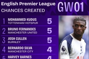 英超首轮创造机会榜:库杜斯、B费、库伦均5次并列榜首