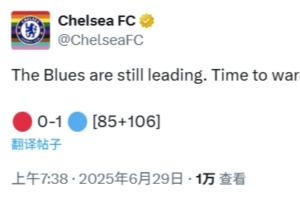 体育资讯06月29日讯 世俱杯1/8决赛,切尔西vs本菲卡,在经历了长达近两个小时的中断后,比赛终于将恢复进行。切尔西官方也更新了比赛时间:85+106分钟!