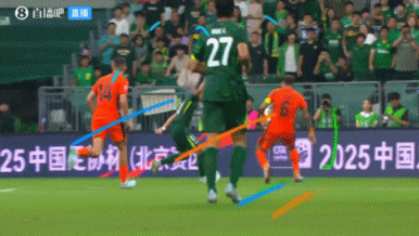 比赛第45分钟,林良铭进攻中在玉昆禁区内倒地,裁判判给国安一个角球。