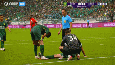 比赛第57分钟,国安首发中卫吴少聪无对抗情况下倒地示意自己受伤,随后他被冯博轩换下。