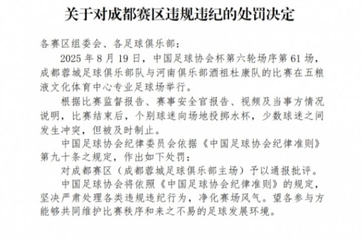 体育资讯08月22日讯 足协官方发布公告,蓉城主场在足协杯对阵河南队的比赛中,有球迷向场地投掷水杯,少数球迷之间发生冲突,但被及时制止,对成都赛区通报批评。