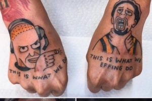 体育资讯8月22日讯 近日,一位步行者球迷将哈利伯顿在今年季后赛锁喉庆祝以及雷吉-米勒的照片分别文在了自己的双手背上。