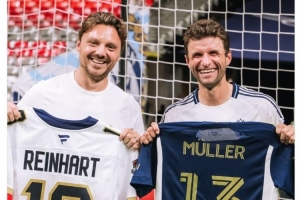 穆勒与效力于NFL佛罗里达美洲豹的加拿大冰球运动员莱因哈特见面,并互换球衣,温哥华白浪社媒晒出两人的合照,配文:“从冰场到球场,穆勒X莱因哈特,互换球衣。”