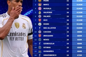 体育资讯6月29日讯 德转盘点了目前世界足坛中场位置球员身价榜,其中贝林厄姆1.8亿欧居首,具体榜单如下(身价相同年龄小者在先):
