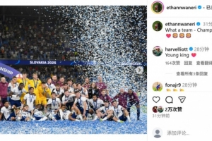 恩瓦内里也在个人社媒晒出与全队庆祝夺冠的大合影,配文写道:“多棒的团队!三狮军团是欧洲冠军!”