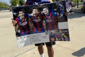 迈阿密国际对阵巴黎的世俱杯1/8决赛即将在北京时间0点打响,本场比赛也吸引了一位来自洪都拉斯的巴萨球迷,他将带着特制的MSN(梅西、苏亚雷斯、内马尔)海报来为梅西加油。