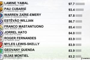 CIES评今年非门将U20球员表现:亚马尔、库巴西前二,斯凯利在列