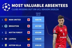 体育资讯8月29日讯 德国转会市场统计了本赛季缺席欧冠球队身价,并列出榜单,曼联8.87亿欧居首,布莱顿、诺丁汉森林二三位。